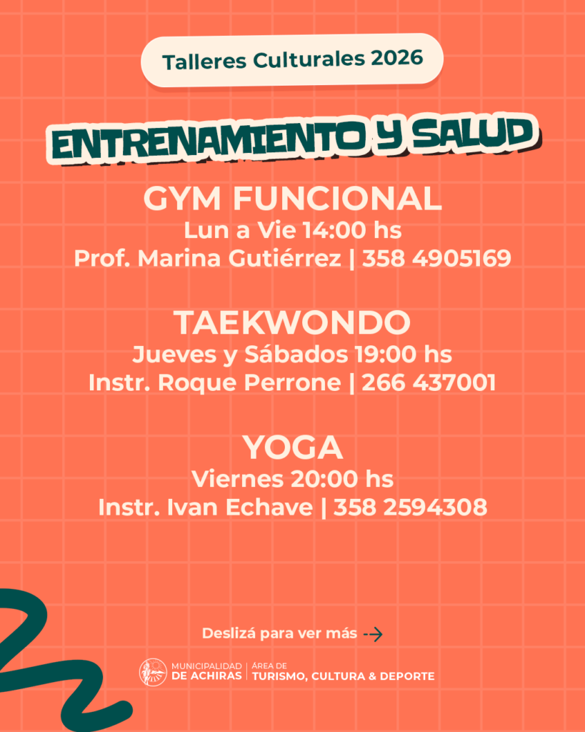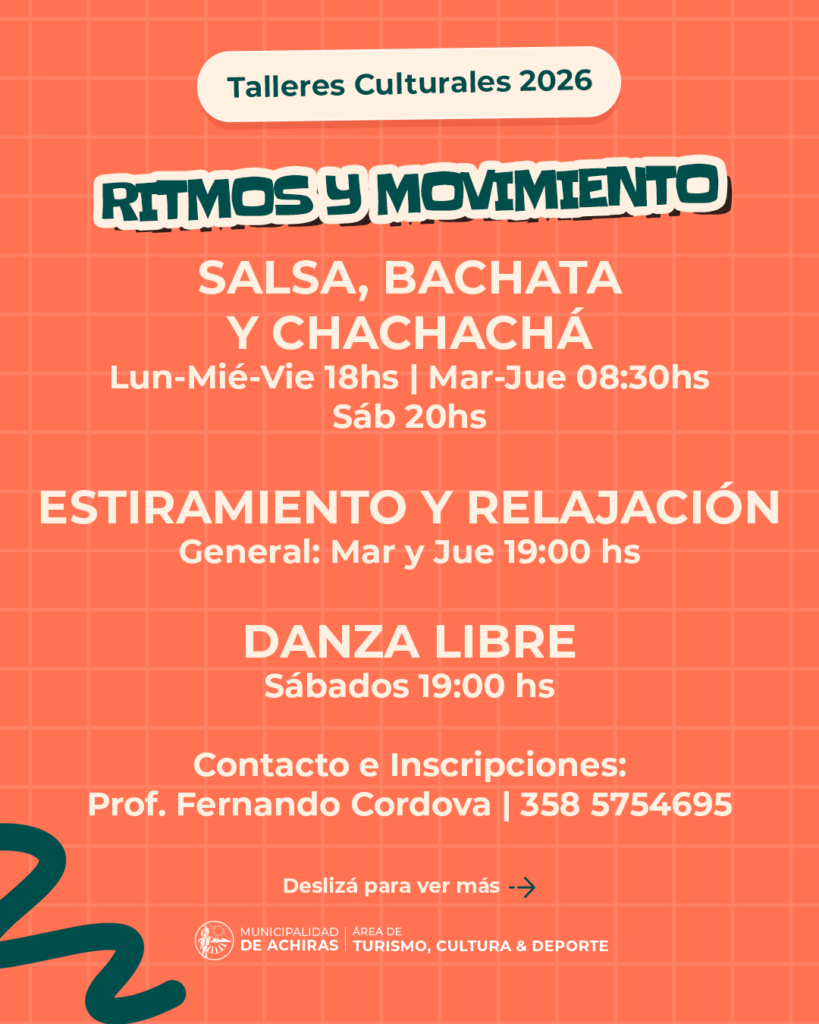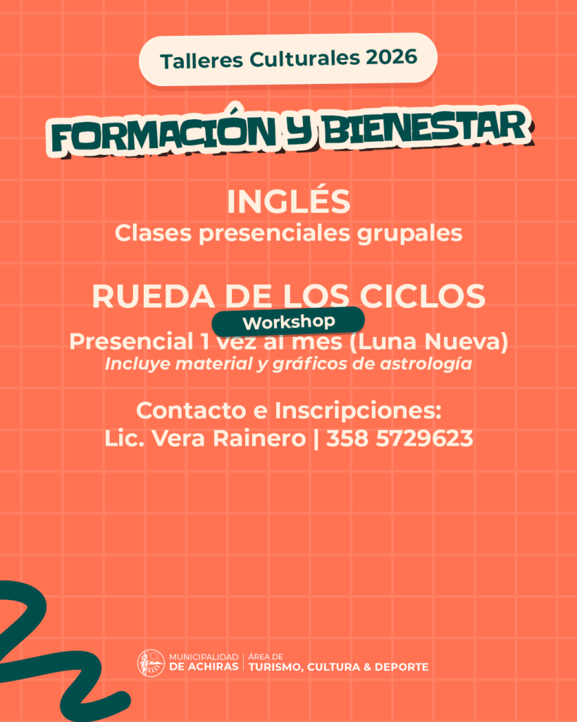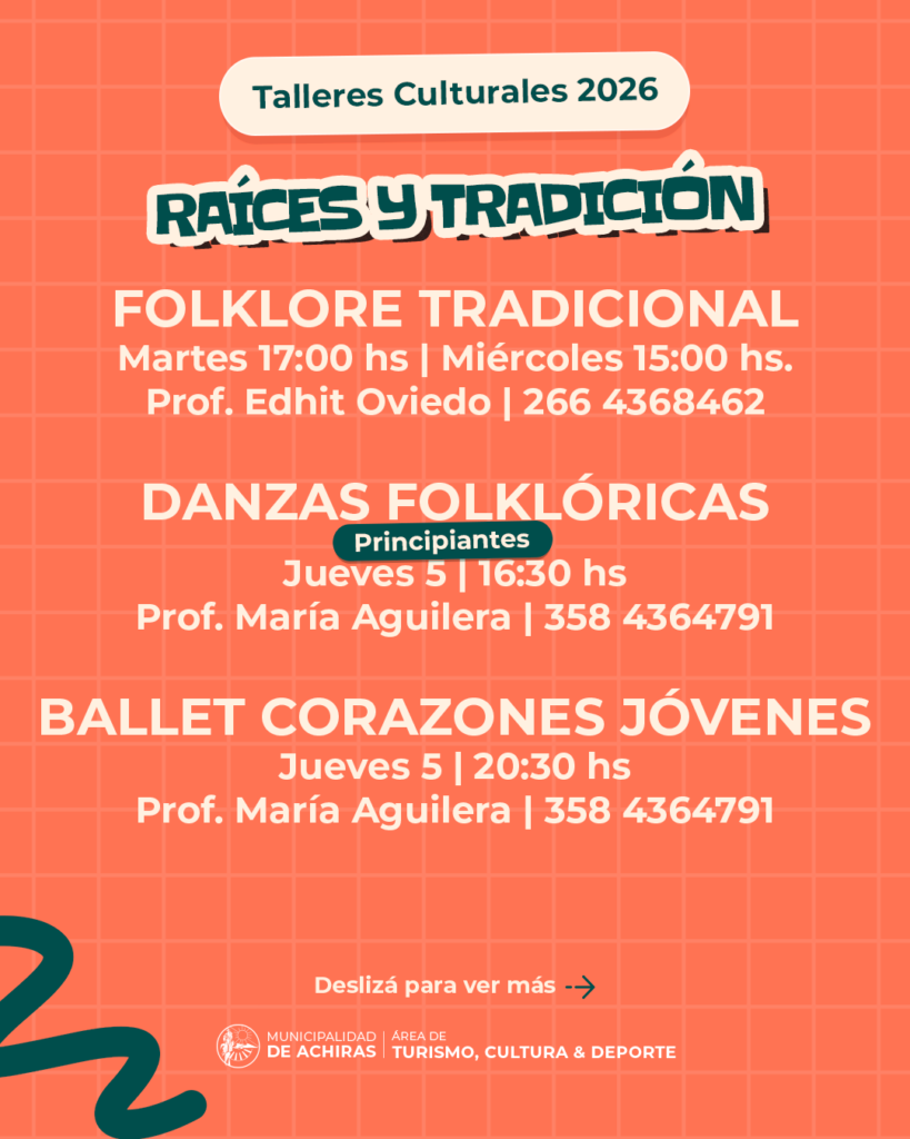 La Municipalidad de Achiras, a través del Área de Turismo, Cultura y Deporte, anuncia la apertura de inscripciones para los Talleres Culturales 2026. El objetivo de este año es brindar a toda la comunidad una oferta diversa que promueva la salud, la formación y el mantenimiento de nuestras tradiciones.